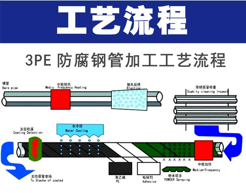 三層防腐結(jié)構(gòu)組成包括: 熔結(jié)環(huán)氧粉末底層、聚合物膠粘劑中間層和聚乙烯面層,其中環(huán)氧粉末底層的作用是形成連續(xù)的涂膜,與鋼管表面粘結(jié)、固化而提供良好的附著力,并具有很好的耐化學(xué)品性和抗陰極剝離能力;聚合物膠粘劑的作用是在環(huán)氧粉末涂料膠化之前與之融合,并與外面的聚乙烯層粘結(jié)