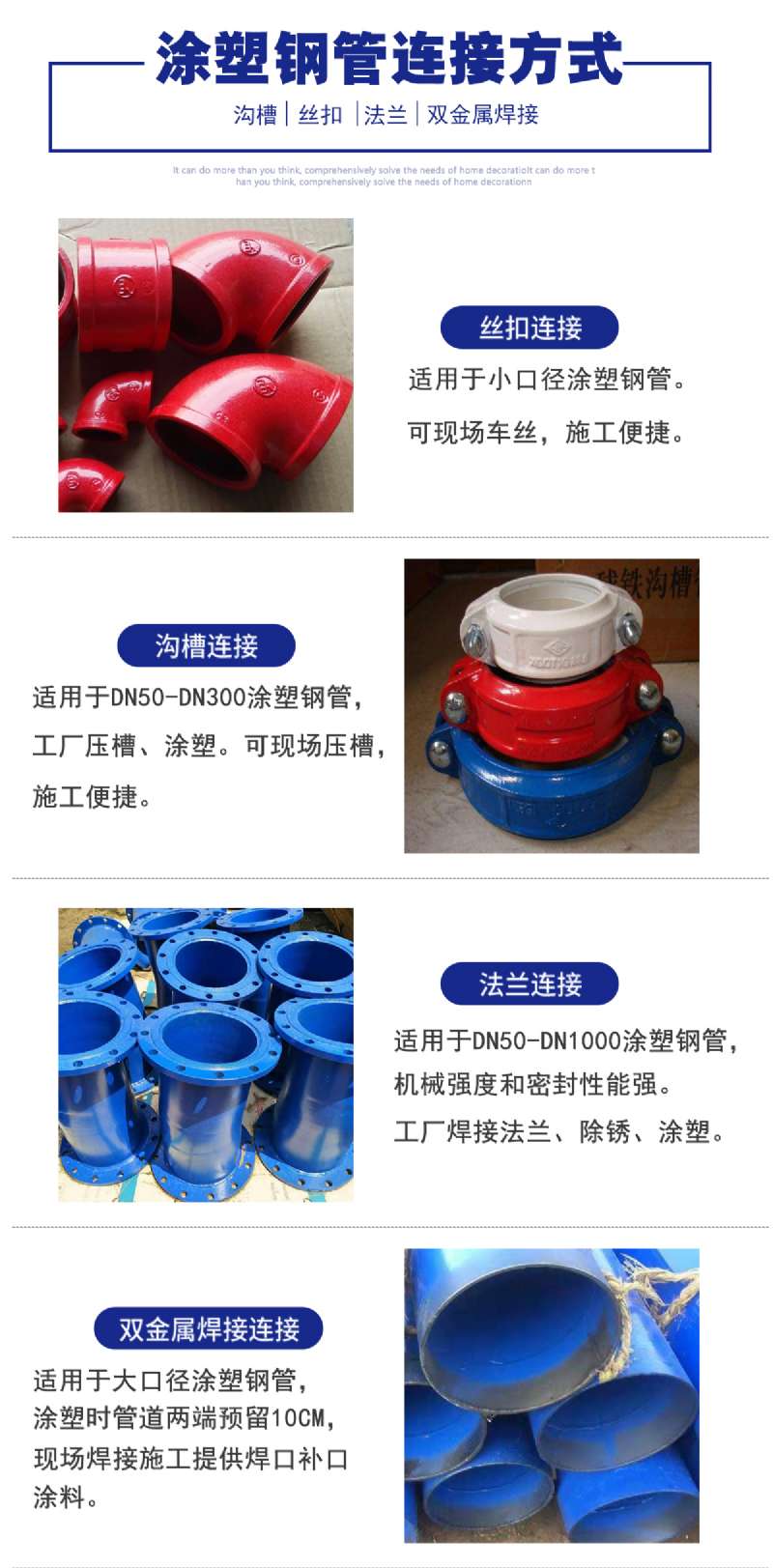 涂塑管,又名鋼塑復(fù)合管、涂塑復(fù)合鋼管,是采用PE(改性聚乙烯)進(jìn)行熱浸塑或EP(環(huán)氧樹脂)進(jìn)行內(nèi)外涂覆的產(chǎn)品,具有優(yōu)良的耐腐蝕性能。同時涂層本身還具有良好的電氣絕緣性,不會產(chǎn)生電蝕。吸水率低,機(jī)械強(qiáng)度高,摩擦系數(shù)小,能夠達(dá)到長期使用的目的。還能有效的防止植物根系及土壤環(huán)境應(yīng)力的破壞等。連接便捷