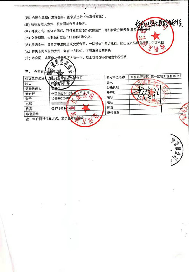 秦皇島開發(fā)區(qū)第一建筑工程有限公司與我公司,2016年簽訂秦皇島開發(fā)區(qū)引青供水工程項(xiàng)目防腐管道合同,我們已最優(yōu)質(zhì)的產(chǎn)品質(zhì)量,順利愉快的完成了這次合作,感謝客戶對(duì)我們的信賴,我公司將一如既往再創(chuàng)輝煌